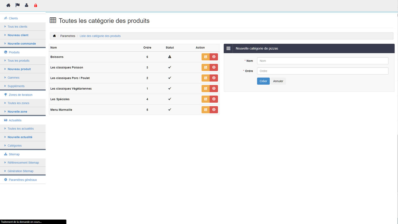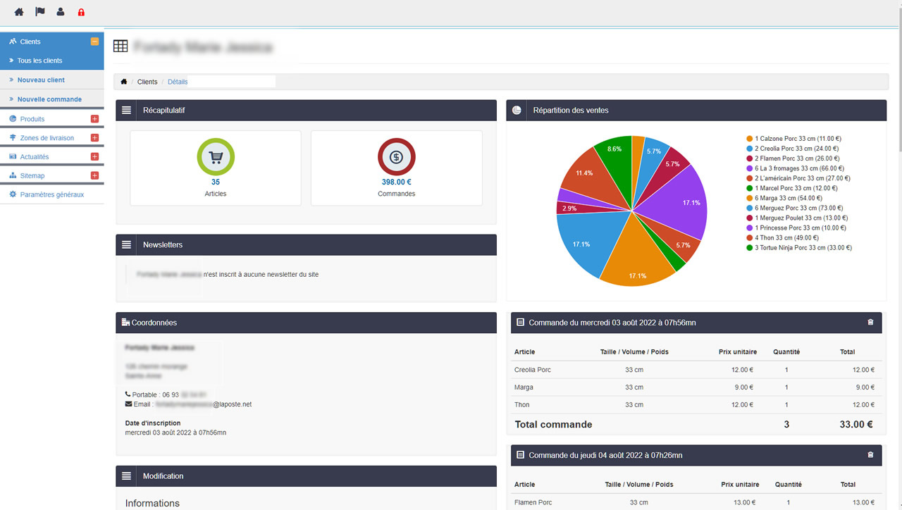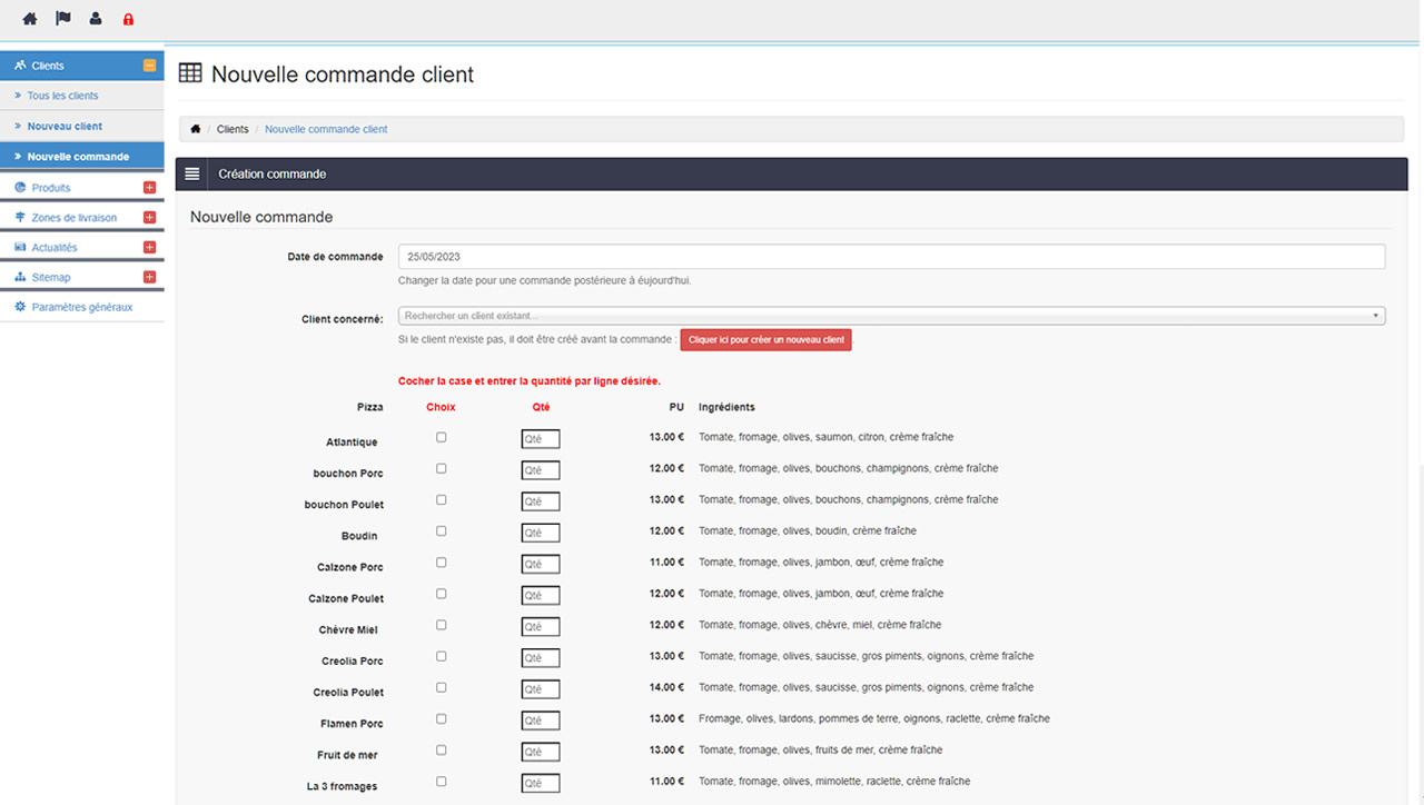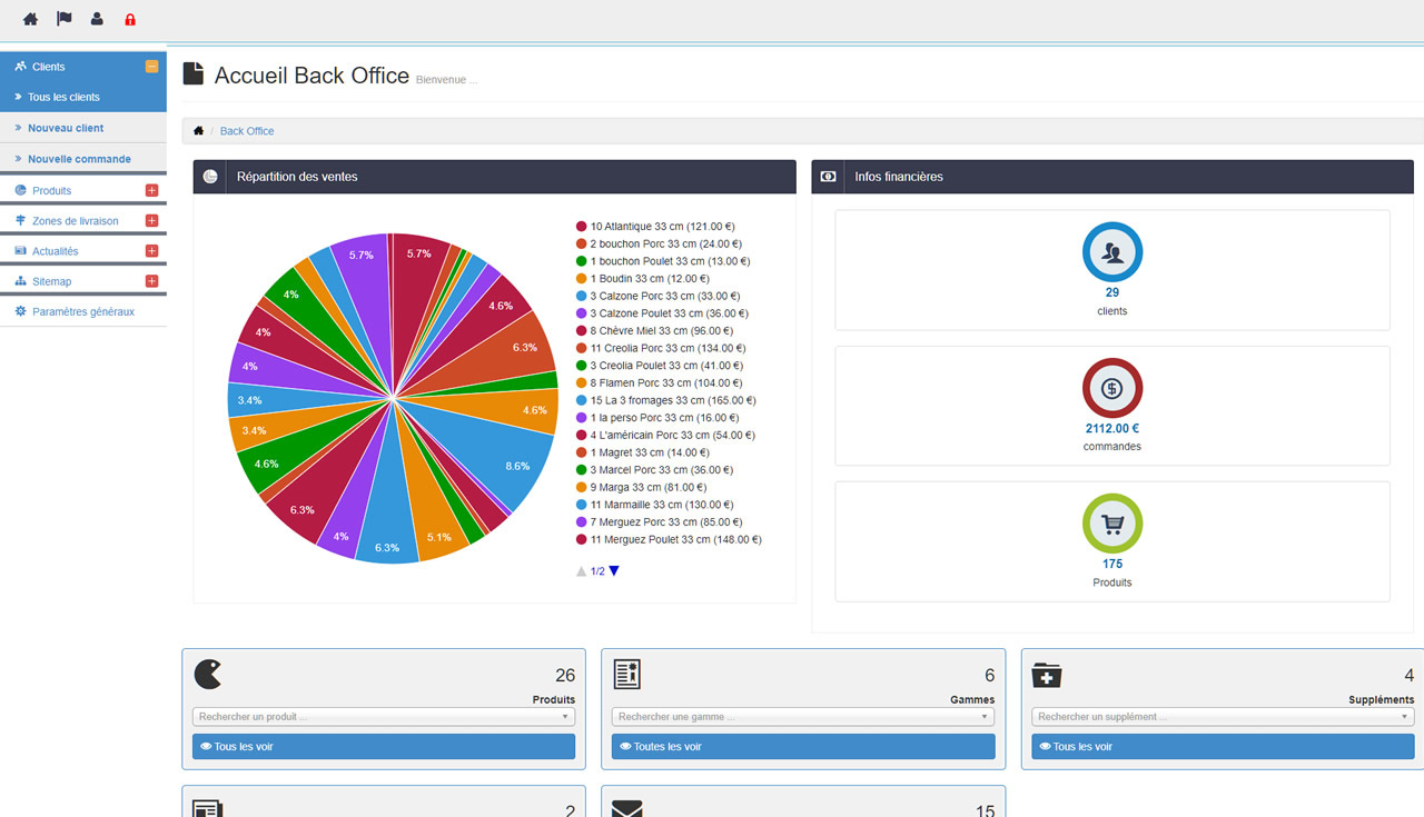 Un site de présentation de la pizzeria avec un espace "actualités", la mise en ligne des pizzas par rubrique, une boutique en ligne, une administration pour les commandes et un outils en mode SAAS pour la centralisation des commandes, la ventilation des ventes, le chiffre d'affaires et les staitstiques de ventes.